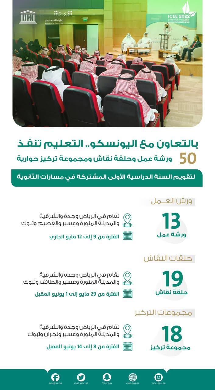 في إطار التعاون بين وزارة التعليم واليونسكو نُفذت وزارة التعليم 50 ورشة عمل وحلقة نقاش ومجموعة تركيز حوارية لتقويم السنة الدراسية الأولى المشتركة في المسارات الثانوي.