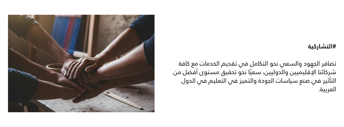 تقديم خدمات إبداعية للارتقاء بجودة وتميز التعليم في الدول العربية، وصناعة تأثير ريادي؛ من خلال نظم ومعايير ومقاييس مبتكرة، وعلاقات إقليمية ودولية مستدامة.