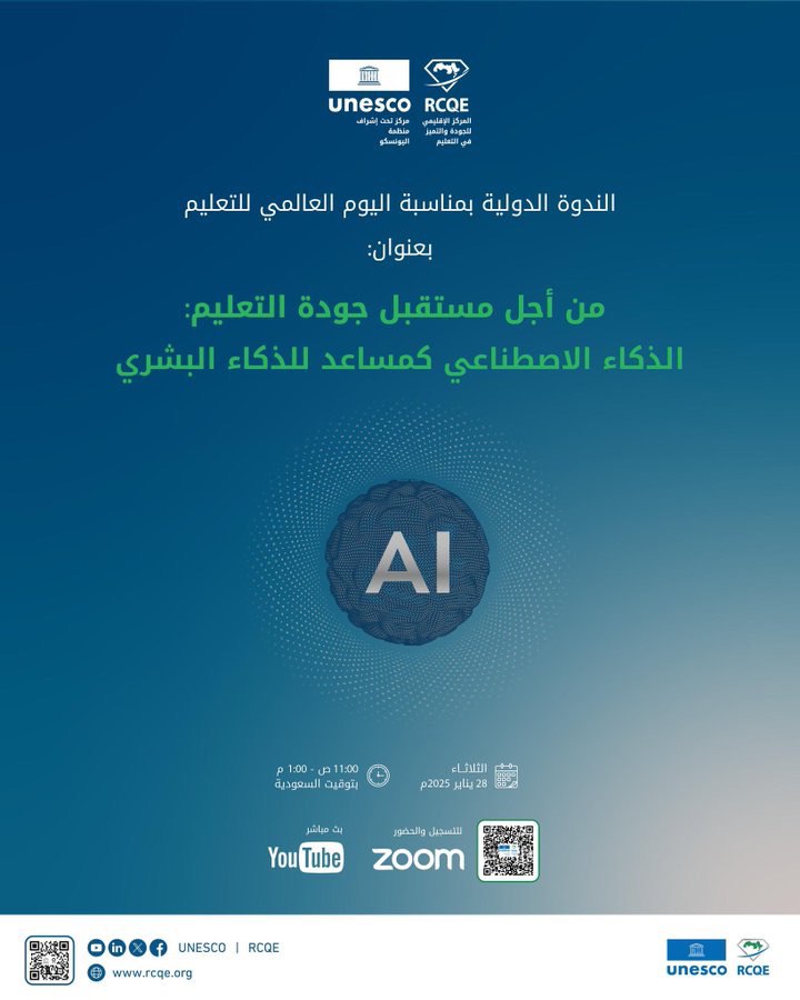 الندوة الدولية بمناسبة اليوم العالمي للتعليم لم تكن مجرد لقاء افتراضي، بل مساحة فكرية جمعت نخبة من الأكاديميين والخبراء والمهتمين من مختلف أنحاء العالم يوم الثلاثاء 28 يناير 2025، لمناقشة واحد من أبرز القضايا الراهنة: كيف يمكن للذكاء الاصطناعي أن يكونشريكًا داعمًا للذكاء البشري في بناء مستقبل أكثر جودة للتعليم. أقيمت الندوة عبر منصتي Zoom وYouTube من الساعة 11 صباحًا حتى 1 ظهرًا بتوقيت السعودية، لتفتح نقاشًاثريًا حول دور التقنيات الحديثة في تطوير العملية التعليمية وتعزيز أثرها في حياة المتعلمين.