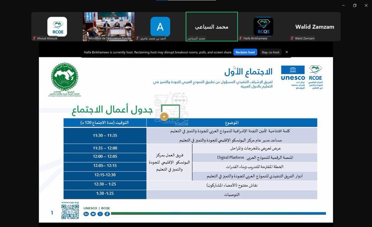 عُقد في 12 مارس 2025 الاجتماع الأول لفريق الإشراف التنفيذي لمتابعة التطبيق التجريبي للنموذج العربي للجودة والتميز في التعليم، أحد أبرز المشاريع الاستراتيجية لمركز اليونسكو الإقليمي للجودة والتميز في التعليم والمنظمة العربية للتربية والثقافة والعلوم (الألكسو)، وذلك بعد إقراره في مؤتمر وزراء التربية العرب بالدوحة خلال الفترة من 5 إلى 7 يناير 2025. وقد شكّل الاجتماع خطوة مهمة لوضع اللبنات الأولى لتفعيل هذا المشروع الطموح، الذي يسعى إلى تطوير أنظمة التعليم في الدول العربية عبر تعزيز الجودة والتميز، ومتابعة التجارب العملية لضمان تطبيقه بشكل مستدام وفعّال، بما يجعل التعليم العربي راسخاً في أسس الجودة ومواكباً لمتطلبات العصر.