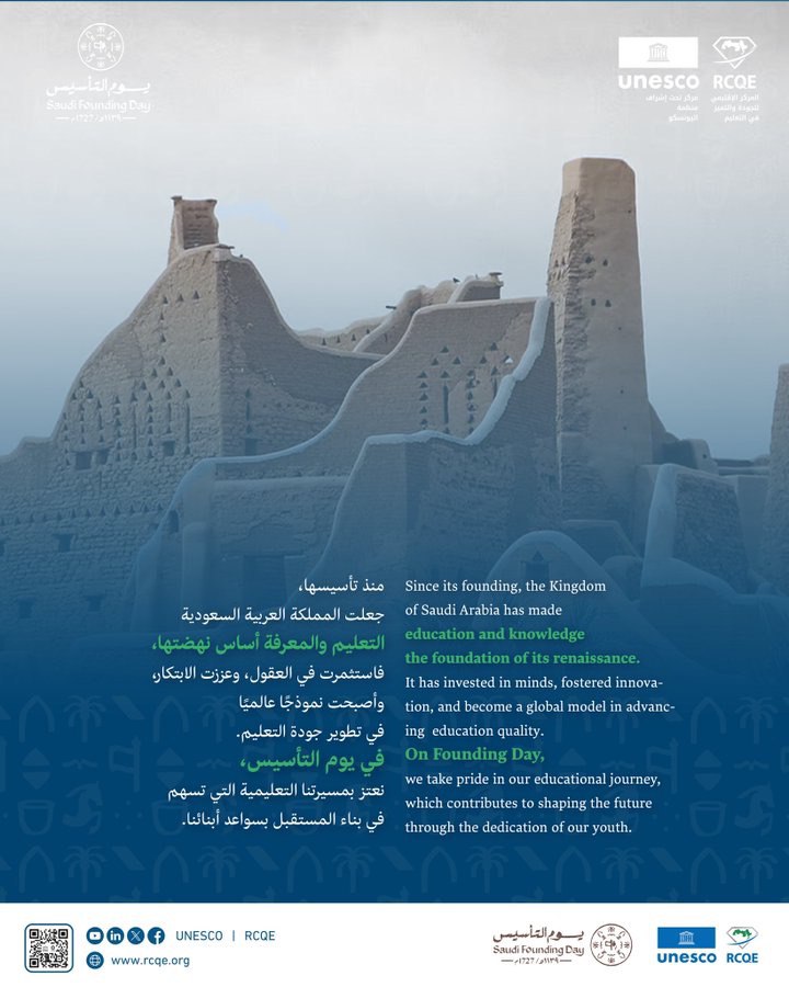 في يوم التأسيس السعودي 5202 نحتفي برحلة التعليم والمعرفة التي شكّلت المملكة العربية السعودية نموذجًا عالميًا في الابتكار وجودة التعليم، مستثمرين في عقول شبابها لبناء مستقبل مشرق. ألقى المدير العام لمركز اليونسكو الإقليمي للجودة والتميز في التعليم د. عبدالرحمن المديرس كلمة أكد فيها أن يوم التأسيس ليس مجرد ذكرى تاريخية، بل محطة لتجديد العزم على المضي قدمًا في مسيرة العلم والتنمية، مستلهمين من إرث الأجداد أسس الدولة السعودية القائمة على الوحدة والعلم والعدل. وأوضح أن التعليم كان دائمًا في قلب رؤيةالمملكة، من تأسيس المدارس والمعاهد إلى الجامعات، ليصبح اليوم منطلقًا للريادة العالمية في جودة التعليم ودعم البحث العلمي والابتكار، مع التأكيد على أن رؤية المملكة 2030 تجعل من التميز والتطوير محركًا أساسيًا لنهضة الوطن ورفعته، مبتهلين إلى الله أن يديم على المملكة أمنها ورخاءها ويبارك مسيرتها التعليمية والتنموية.